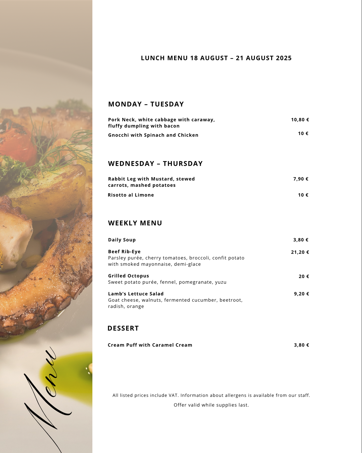 The lunch menu is served every weekday from 11:30 a.m. to 3:00 p.m.